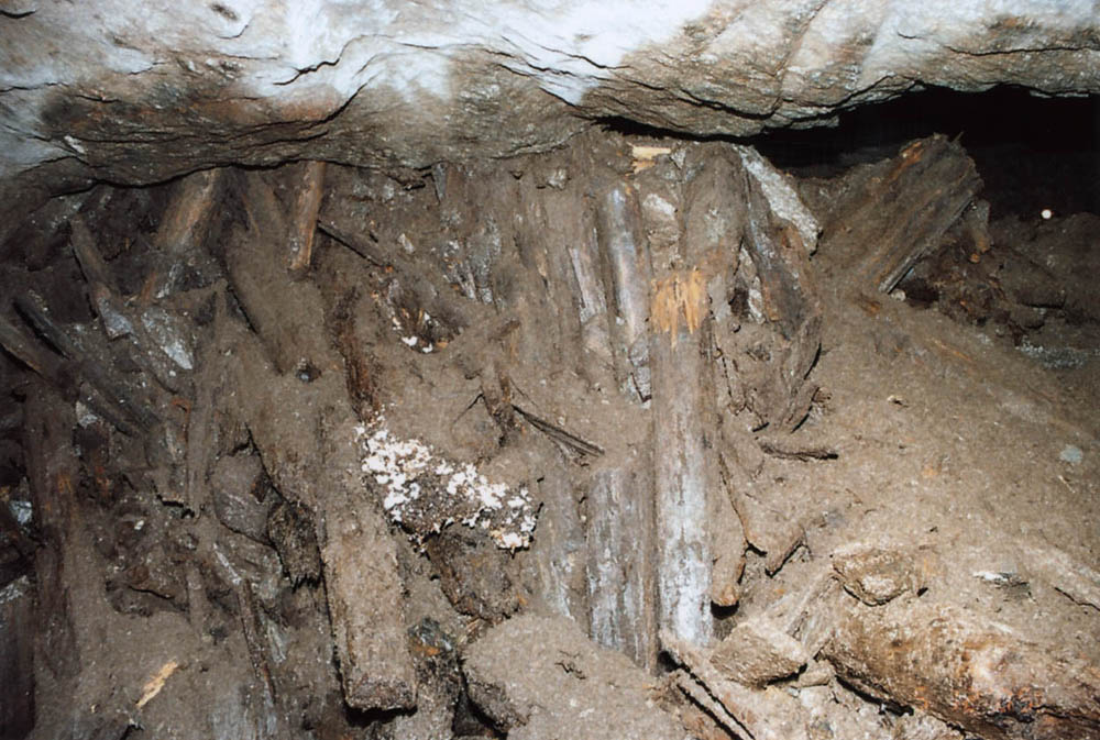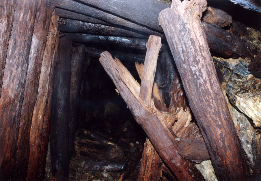 Verbrochener Holzausbau im Schacht 302 in Marienberg, Teufe ca. 100 m